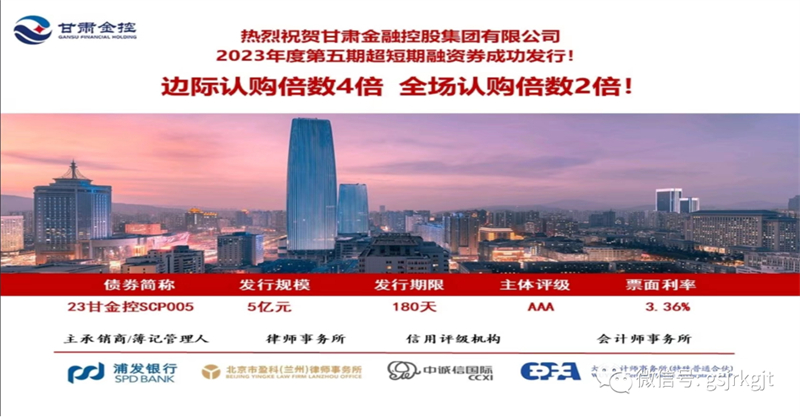 2023年12月14日,甘肅金控集團成功發(fā)行2023年度第五期超短期融資券,發(fā)行規(guī)模5億元,債券期限180天,票面利率3.36%。本次債券發(fā)行獲得了銀行、券商、公募基金等金融機構的踴躍認購,邊際認購倍數(shù)4倍,全場認購倍數(shù)2倍。