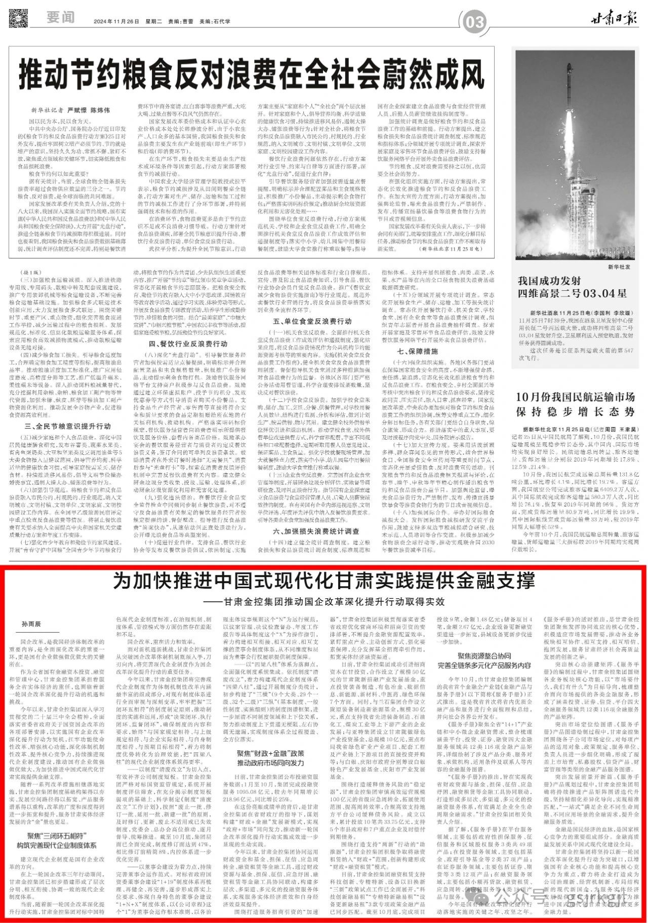 今年以來,甘肅金控集團深入學習貫徹黨的二十屆三中全會精神,全面落實省委省政府關(guān)于國資國企改革的各項部署安排,以實施國有企業(yè)改革深化提升行動為契機,扛牢功能使命性改革、增強核心功能,深化體制機制性改革、提升核心競爭力,持續(xù)推進現(xiàn)代企業(yè)制度建設(shè),推動國有企業(yè)做強做優(yōu)做大,為加快推進中國式現(xiàn)代化甘肅實踐提供金融支撐。